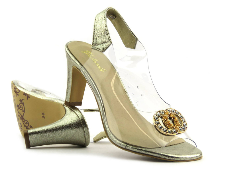 Dámské sandály Yolanda jsou vyrobeny z přírodní kůže zlaté barvy a průhledného silikonu . Transparentní silikonový svršek krásně prezentuje nohu a zeštíhluje ji. Dobře sedí a nepřehřívá se. Na boku má speciální perforaci pro přívod vzduchu. Kožená stélka zajišťuje dostatečný komfort. Gumička všitá do patního pásku drží nohu na správném místě a usnadňuje nazouvání. Model je upevněn na vysokém, dobře profilovaném a elegantně střiženém sloupku potaženém kůží. Charakter modelu dodává působivé zdobení šperků na přední straně sandálů.