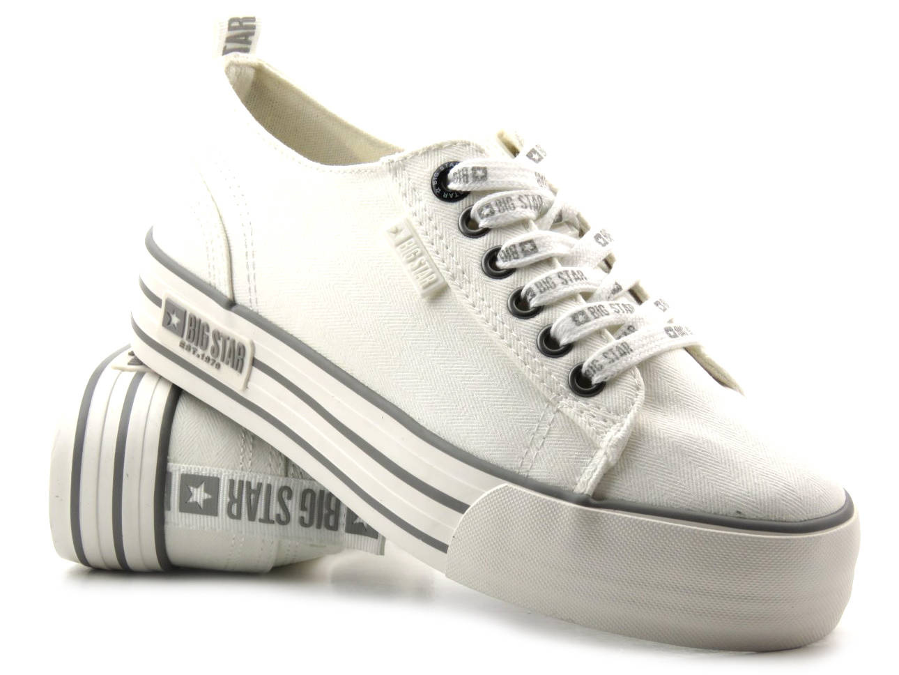 Tenisky renomované značky Big Star jsou z vnější strany vyrobeny z odolné bílé látky . Podšívka je podšitá měkkou tkaninou, která pokrývá chodidla a poskytuje jim pohodlí . Tenisky Big Star jsou opatřeny originálními tkaničkami s logem značky . Na patě je vsadka, která usnadňuje nazouvání. Celé je to nasazeno na tlustou podrážku, platformu s dobrou přilnavostí a tlumením nárazů. Bílá barva se krásně kombinuje s celou paletou barev, takže ji snadno zapadnete do každodenního stylingu. Ať už džíny, černé nebo barevné úzké džíny – bílé tenisky se budou hodit.