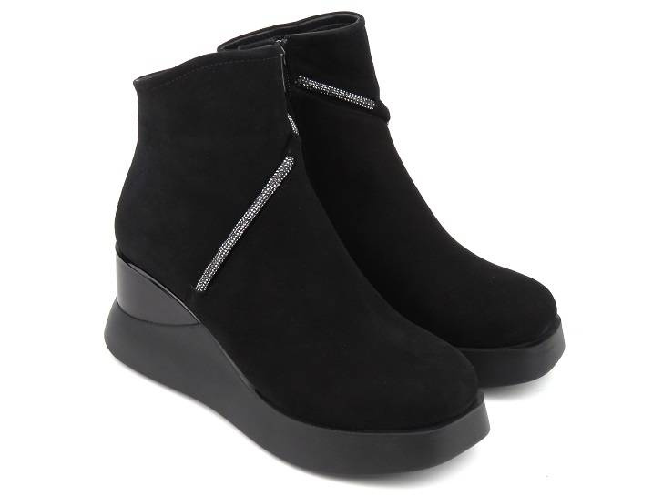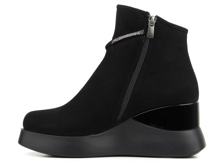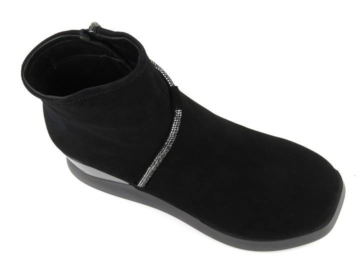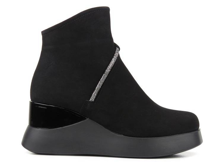 Dámské kotníkové boty renomované značky Venezia jsou vyrobeny z kvalitní černé nubukové kůže . Vnitřek je zateplen plstí . Zip umožňuje snadné obouvání . Velmi originální 7 cm klínek pěkně zeštíhluje postavu, aniž by kazil pohodlí při chůzi. Klín je jemně zvýrazněn lakovanou vsadkou. Černé kotníkové boty Venezia zdobí pásek z lesklých kamínků.