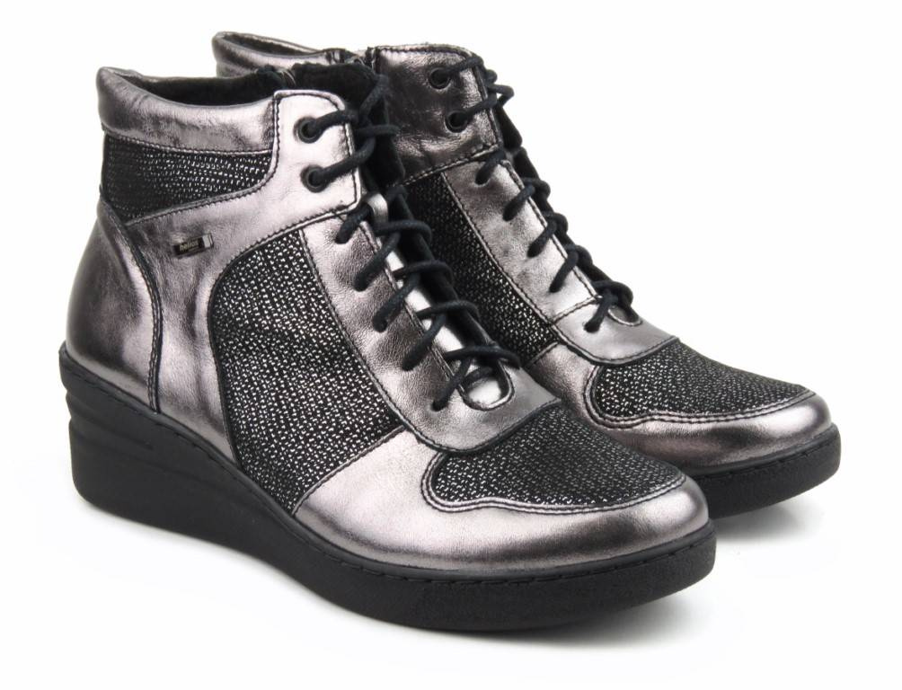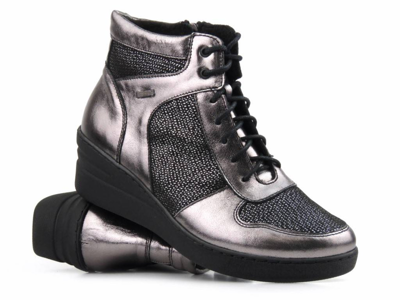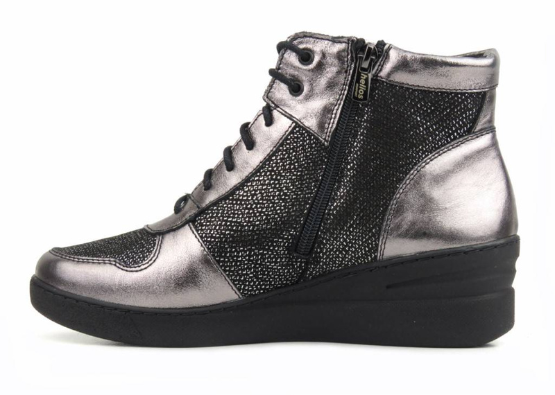 Dámské kotníkové boty renomované polské značky Helios Komfort jsou vyrobeny z vysoce kvalitní stříbrné přírodní kůže . Izolovaný vnitřek chrání před chladem. Zip umožňuje rychlé a pohodlné nazouvání a šněrování usnadňuje úpravu svršku. Pohodlný lehký klínový podpatek pěkně zeštíhluje postavu. Sportovní střih s metalickou a třpytivou kůží zpestří každý styling.