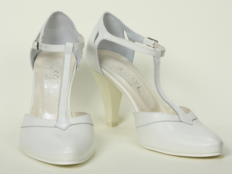 Svatební lodičky renomované polské značky Kotyl jsou vyrobeny z vysoce kvalitní ecru přírodní lícové kůže. Kožená podšívka zajišťuje dostatečný komfort pro nohy. Stélka je lemována měkkou houbou. Špička lodiček má jemný, mandlový tvar. Díky nastavitelnému kotníkovému pásku boty nepadají z nohy. Lodičky jsou postavené na pohodlném stabilním podpatku.