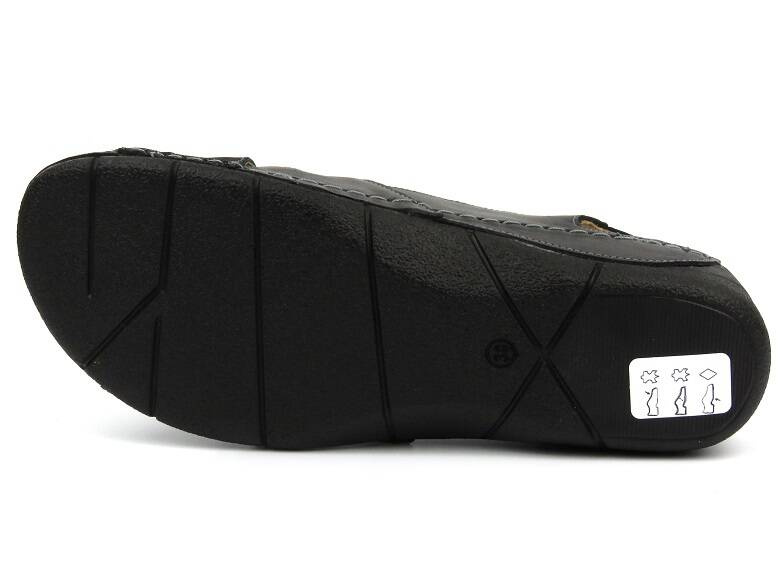 Dámské sandály renomované polské značky Helios Komfort jsou vyrobeny z kvalitní celozrnné přírodní kůže v odstínu světle hnědé. Měkká kožená podšívka zajišťuje vysoký komfort pro nohy. Pod vložkou je měkká SOFT houbička . Díky pohodlnému zapínání na suchý zip lze boty snadno přizpůsobit noze. Svršek s motivy trojúhelníků je osazen na silné, dřevěné podrážce s výrazně vyznačenými drážkami.