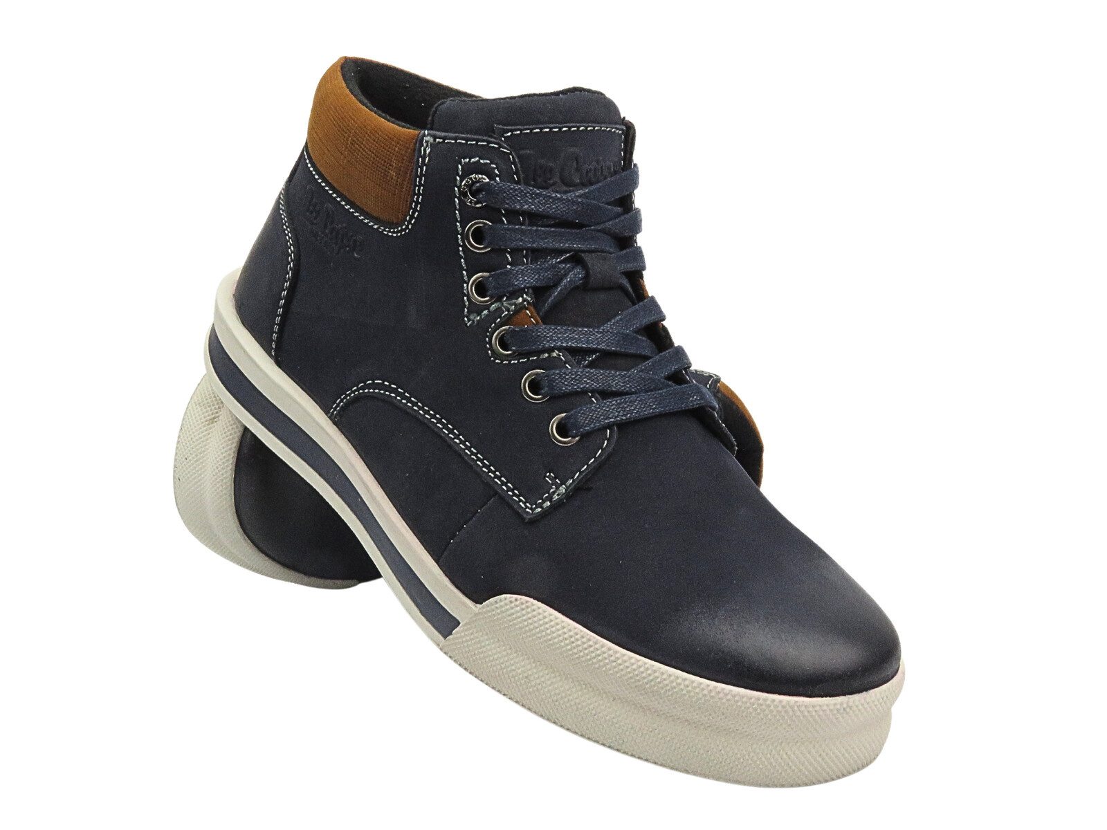Zimní pánská obuv britské značky Lee Cooper je vyrobena z ekologické kůže v tmavě modré barvě.