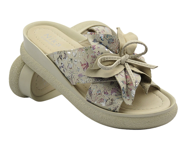 Dámské kožené pantofle Nika Komfort H-483, béžové s květinovým vzorem