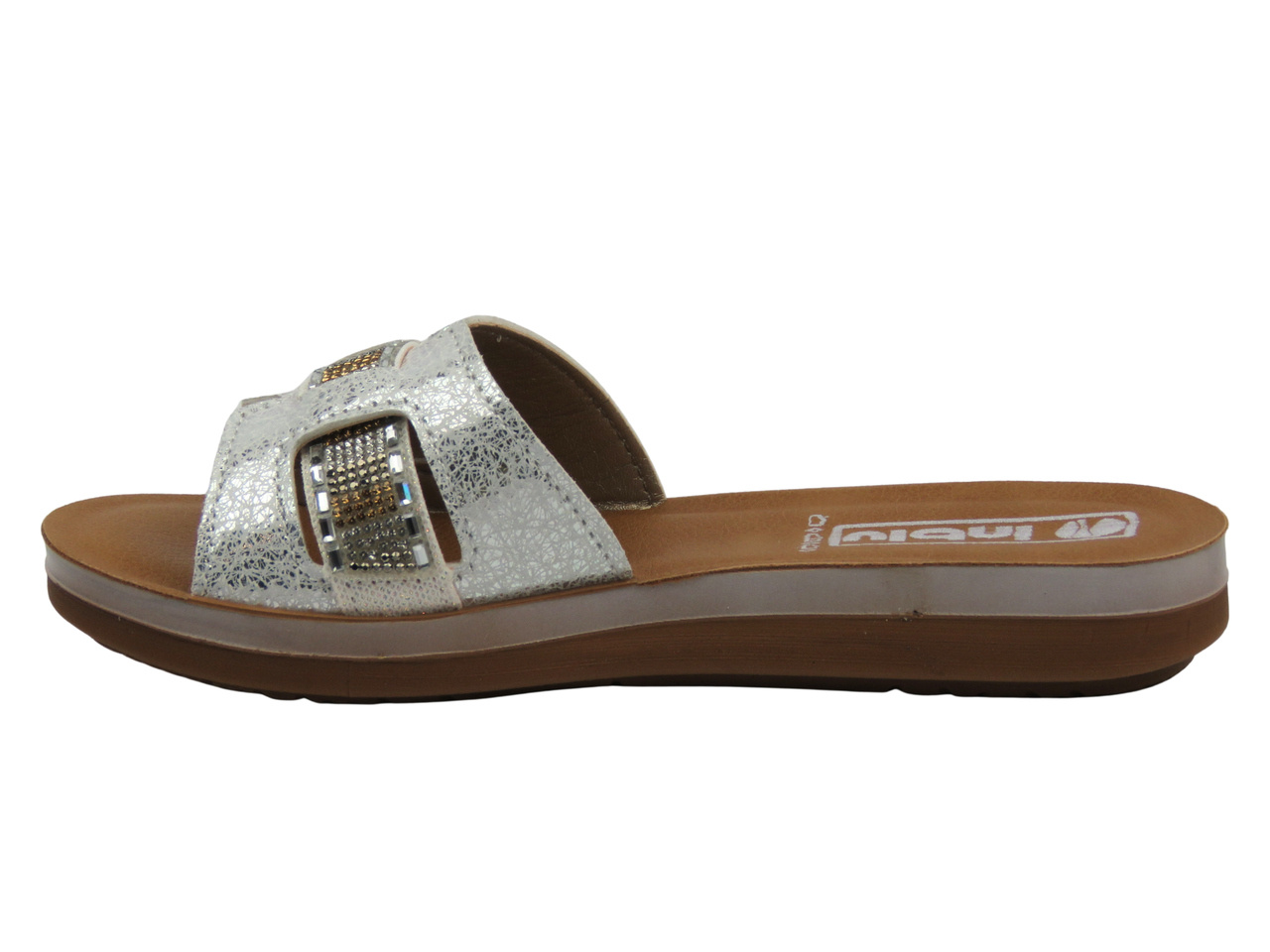 Inblu ZO-08 jsou elegantní a pohodlné dámské pantofle v nadčasové bílé barvě, které jsou ideální do letních outfitů. Lesklé ozdoby na svršku dodávají botám jedinečný a ženský vzhled.
