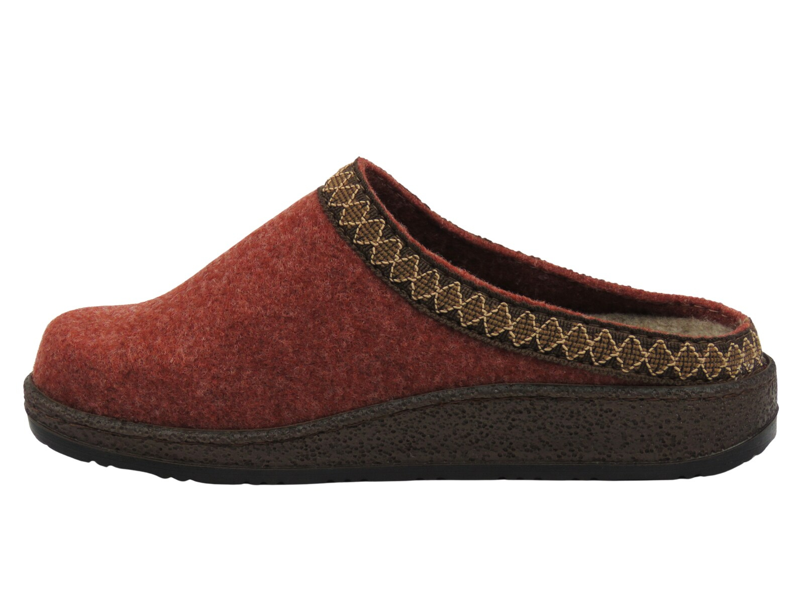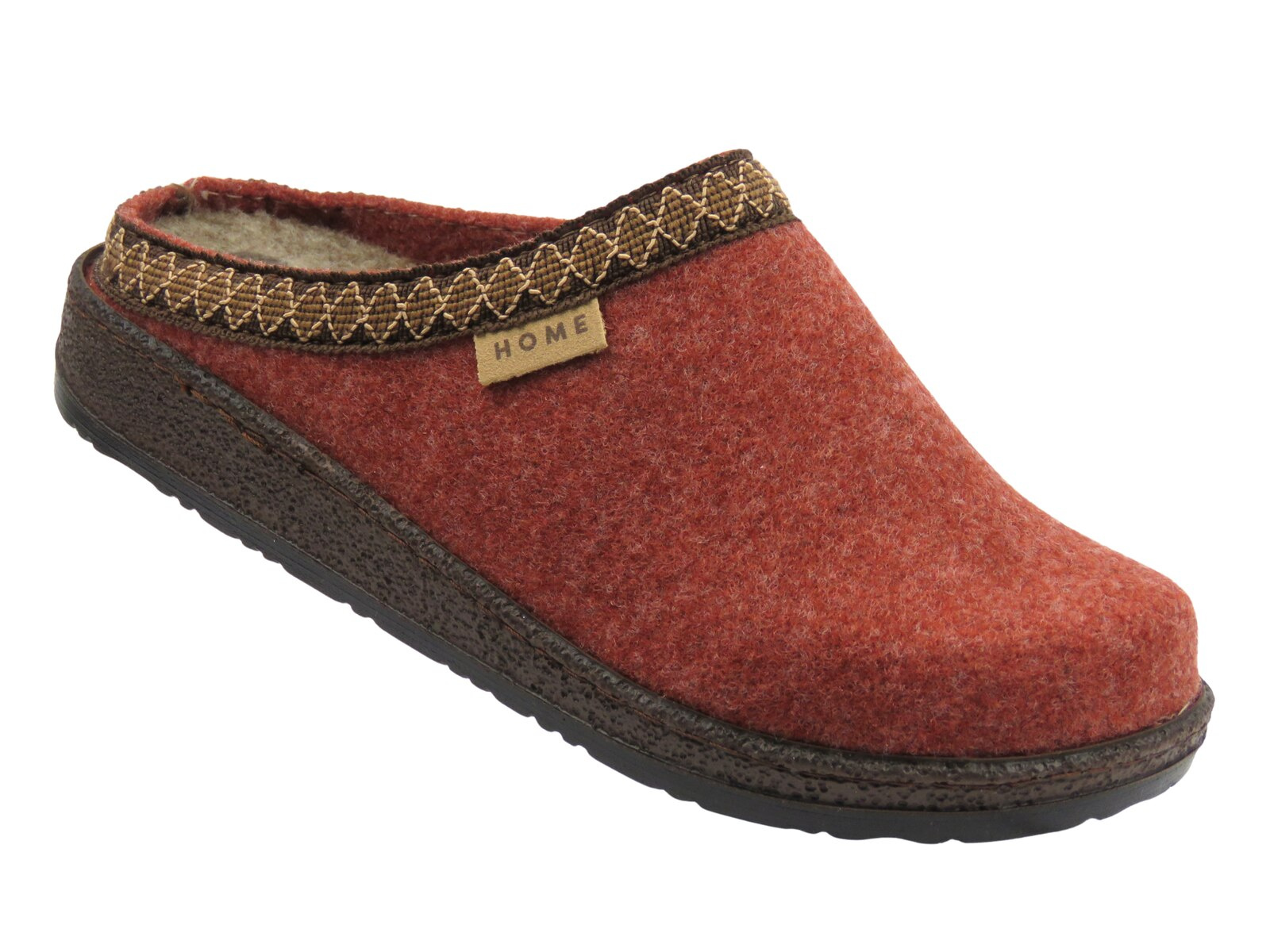 Rezavá barva dodává hřejivý dojem, zatímco ozdobné lemování kolem horní části přidává rustikální charakter. 3 cm vysoká podrážka je lehká, pružná a protiskluzová, takže zajistí stabilitu na všech typech domácích podlah.