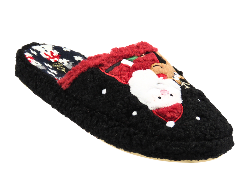 Na svršku se nachází roztomilá vánoční výšivka s Mikulášem a sobem, která dodává radostnou, sváteční atmosféru. Vnitřek papučí je vyroben z měkké textilie se zimním vzorem, která zajišťuje pohodlí a izolaci od studené podlahy.
