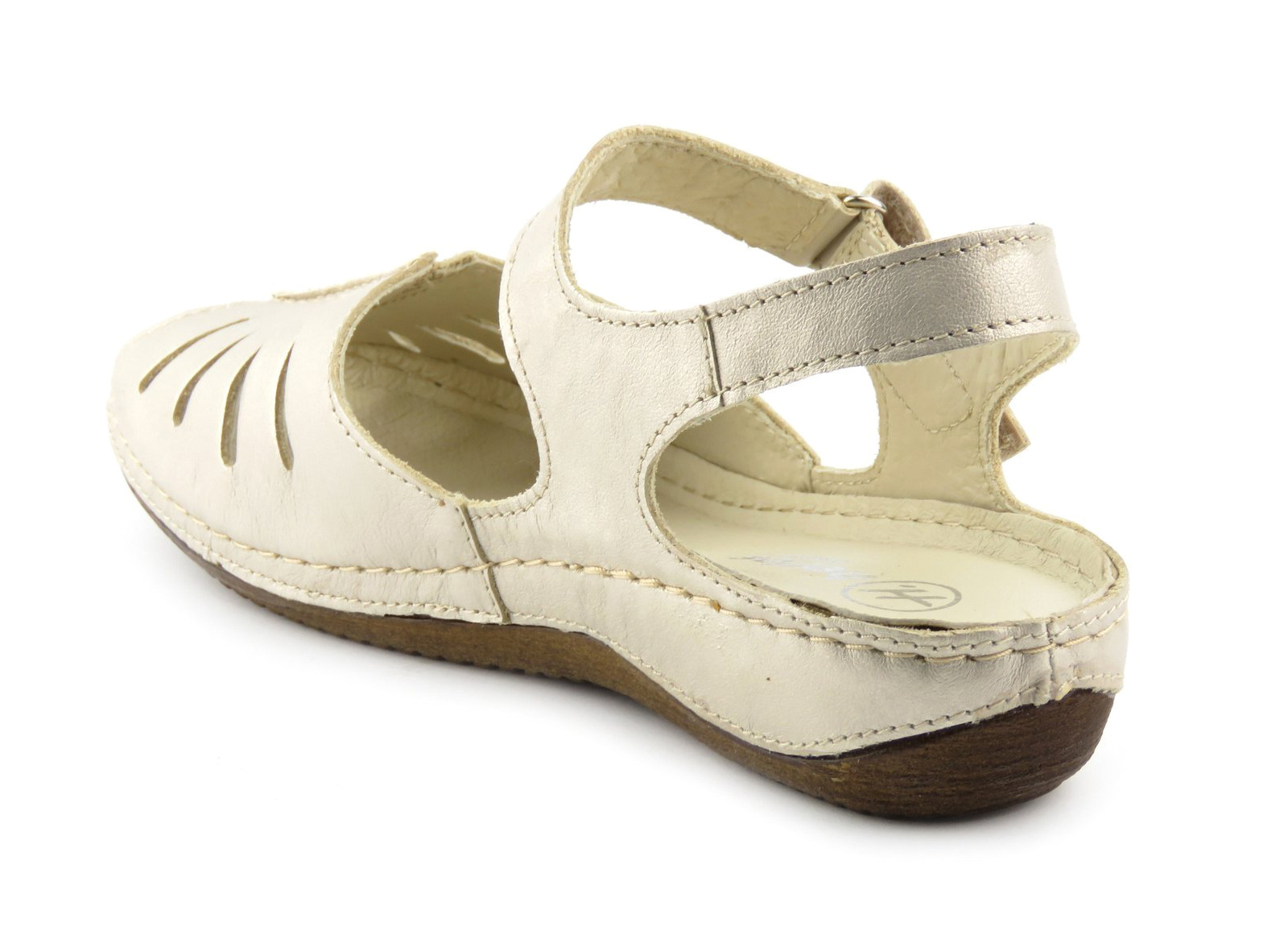 Dámské sandály renomované polské značky Helios Komfort jsou vyrobeny z kvalitní přírodní kůže v barvě metalického zlata. Kožená podšívka zajišťuje vysoký komfort pro nohy. Pod stélkou je měkká SOFT houbička . Zapínání na suchý zip umožňuje rychlé a pohodlné nazouvání obuvi. Podrážka je lehká a pružná . Prolamovaný svršek poskytuje prodyšnost a dodává botám originální vzhled.