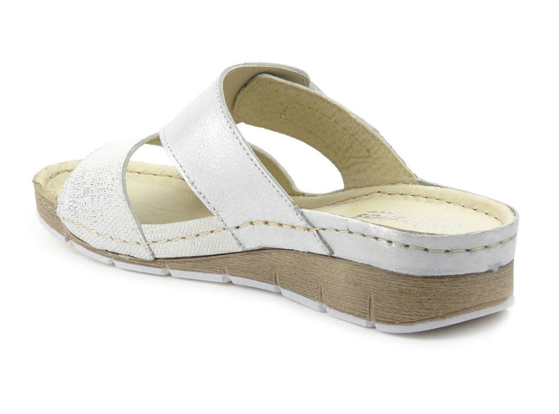 Dámské žabky renomované značky Helios Komfort jsou vyrobeny z kvalitní celozrnné přírodní kůže . Měkká kožená podšívka zajišťuje vysoký komfort pro nohy. Měkká SOFT pěna je instalována pod stélkou pro pohodlí při každém kroku. Pásek na suchý zip umožňuje upravit svršek pro lepší přizpůsobení. Model je osazen na zvýšené podrážce z lehkého pružného materiálu připomínajícího dřevo.