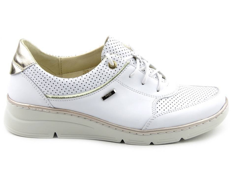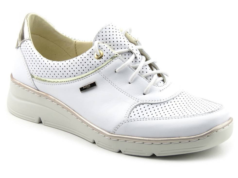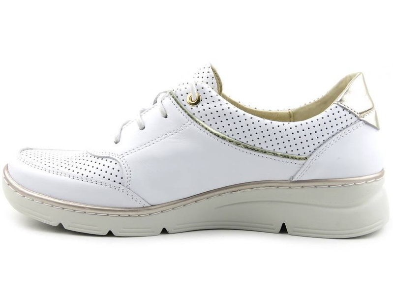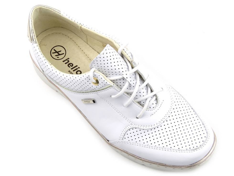 Dámské boty renomované polské značky Helios Komfort jsou vyrobeny z vysoce kvalitní bílé celozrnné přírodní kůže . Měkká kožená podšívka zajišťuje vysoký komfort pro nohy. Pod profilovanou vložkou je měkká SOFT houbička . Šněrování umožňuje nastavení svršku na různé šířky chodidla. Design je zpestřen kovovým podpatkem a kulovitými řezy. Celé je to osazeno na lehké, bílé podrážce s lesklým lemem.