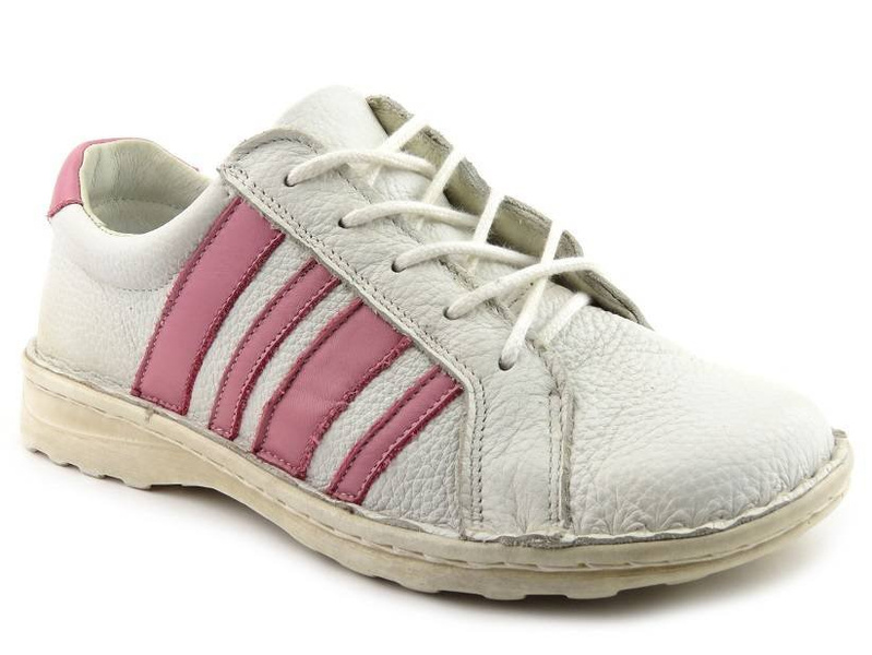 Dámské boty renomované polské značky Helios jsou vyrobeny z vysoce kvalitní celozrnné přírodní kůže . Kožená podšívka zajišťuje dostatečný komfort pro nohy. Model byl vyroben unikátní metodou flexibilní montáže, která spočívá v přišití svršku k podešvi pevnými švy, což zvyšuje jejich odolnost. Bílý svršek zdobí růžové pruhy.
