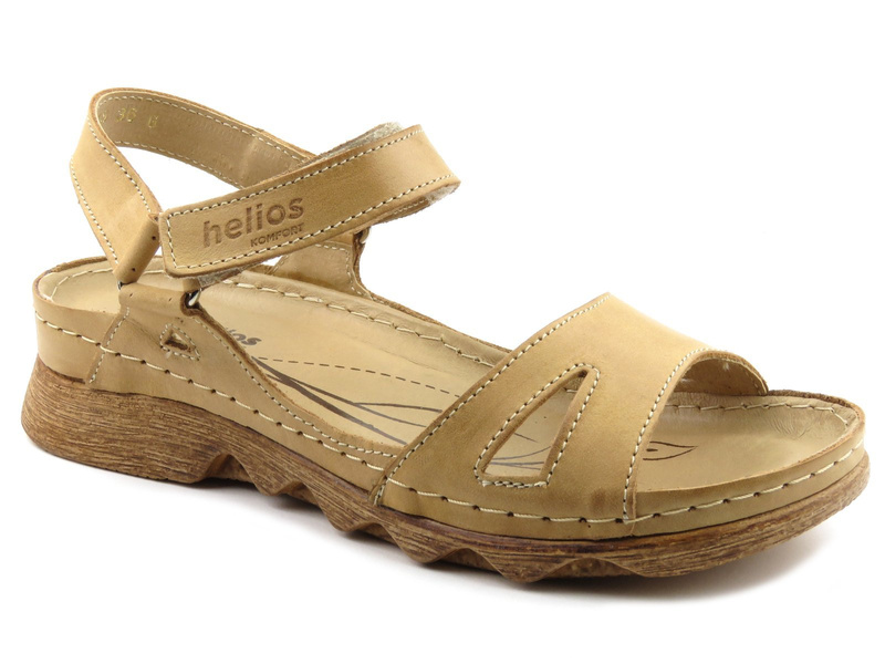 Dámské sandály renomované polské značky Helios Komfort jsou vyrobeny z kvalitní celozrnné přírodní kůže v odstínu světle hnědé. Měkká kožená podšívka zajišťuje vysoký komfort pro nohy. Pod vložkou je měkká SOFT houbička . Díky pohodlnému zapínání na suchý zip lze boty snadno přizpůsobit noze. Svršek s motivy trojúhelníků je osazen na silné, dřevěné podrážce s výrazně vyznačenými drážkami.