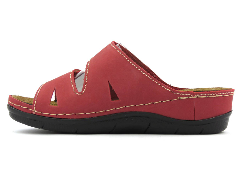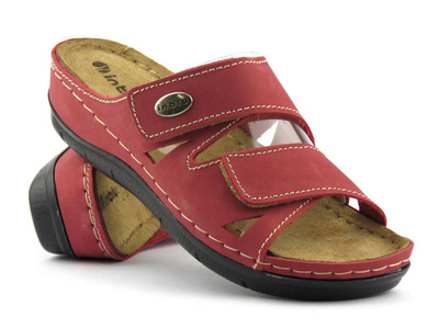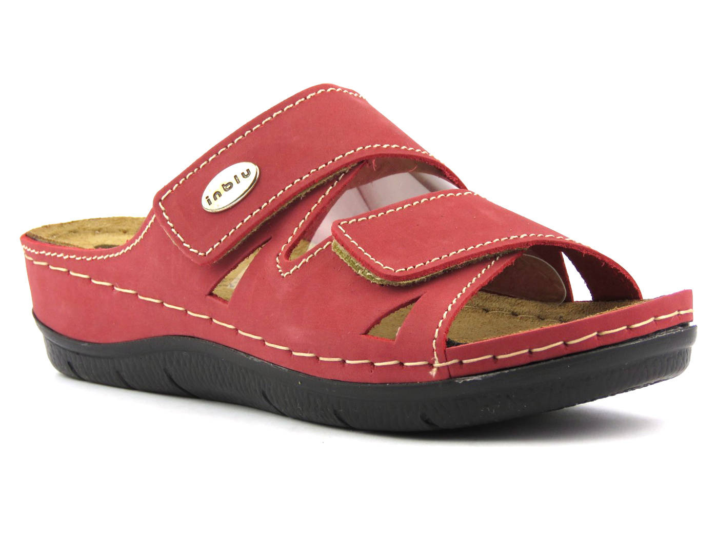 Dámské žabky renomované značky Inblu jsou vyrobeny z červené přírodní kůže . Měkká kožená podšívka a stélka lemovaná houbou poskytují nohám odpovídající pohodlí. Žabky mají dva nastavitelné pásky se zapínáním na suchý zip , takže se snadno přizpůsobí noze. Model je upevněn na lehkém, malém klínu. Podrážka dobře přilne k zemi.